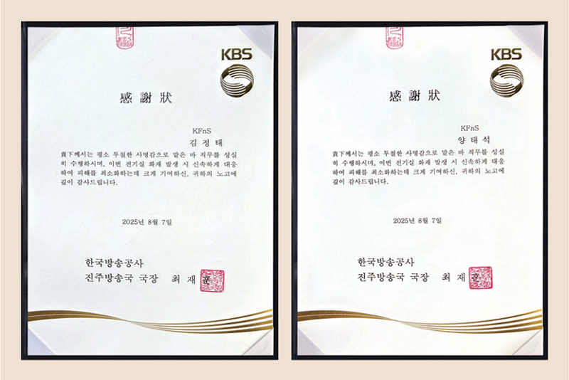 케이에프앤에스 KBS 진주방송국 화재초동대처 우수 감사장 수상
