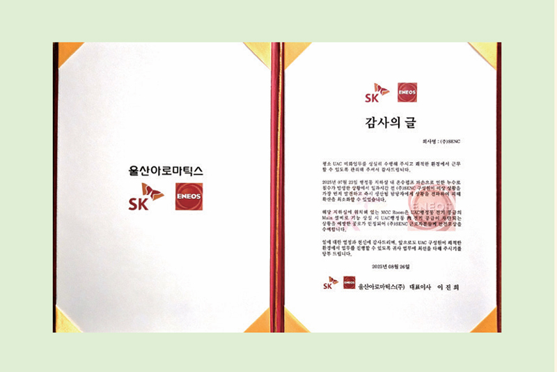 에스이엔씨 울산아로마틱스로부터 안전보건 우수상 수상